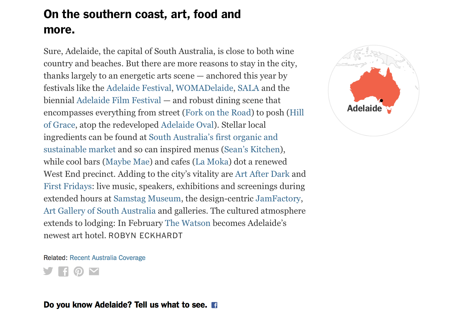 Adelaide made it, and was the only Australian location listed, within the article Fork on the Road is mentioned as something to do.